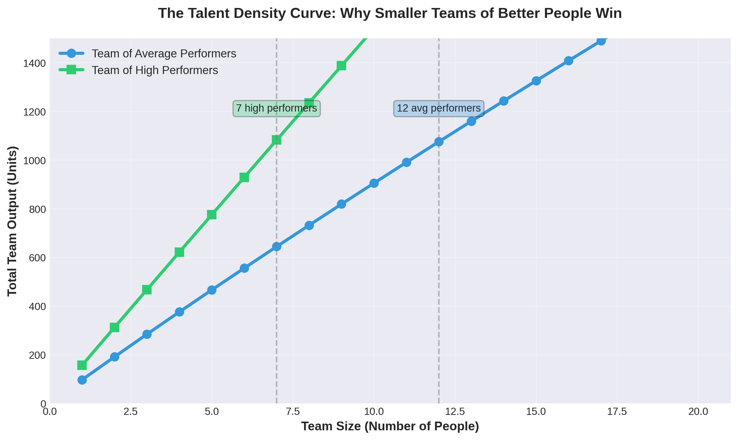 Look at what’s happening in this chart. The blue line represents a team of average performers. Output grows as you add people, which makes intuitive sense. But notice what happens as the team gets larger: the growth rate starts to slow down, eventually reaching a plateau, and in some cases actually starting to decline. That’s the coordination costs overwhelming the productivity gains from additional headcount. You’re adding bodies, but they’re spending so much time coordinating with each other that total output barely budges.