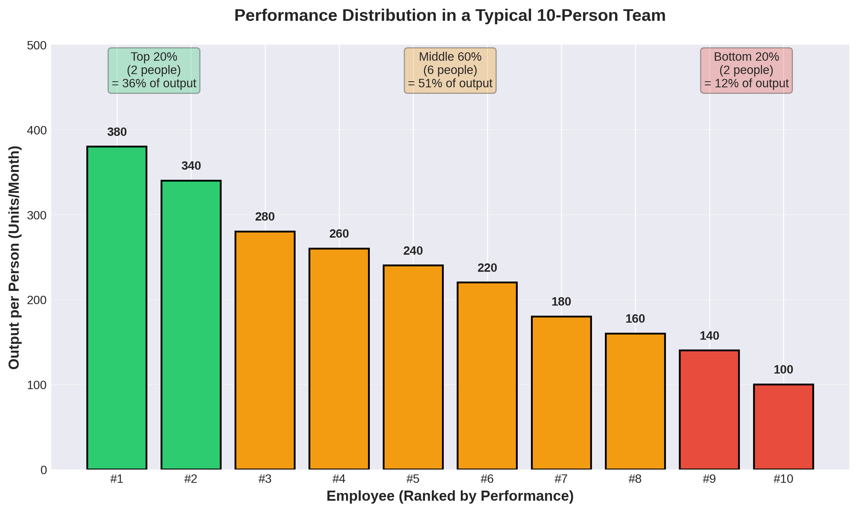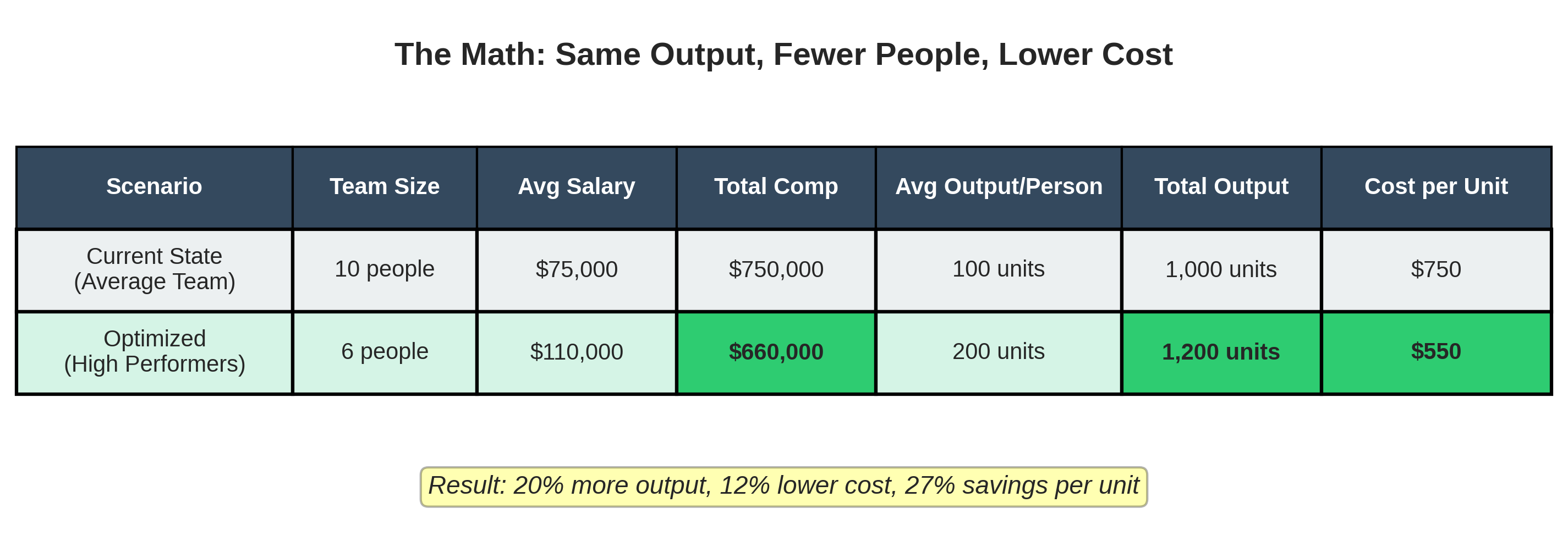 Here’s the insight that makes this actionable: seven high performers will produce more total output than twelve average performers. Let me say that again because it’s the crux of the entire framework: you can achieve higher total output with 40% fewer people if those people are substantially better. This isn’t theory. This isn’t aspiration. This is math, and it plays out in real organizations every quarter.