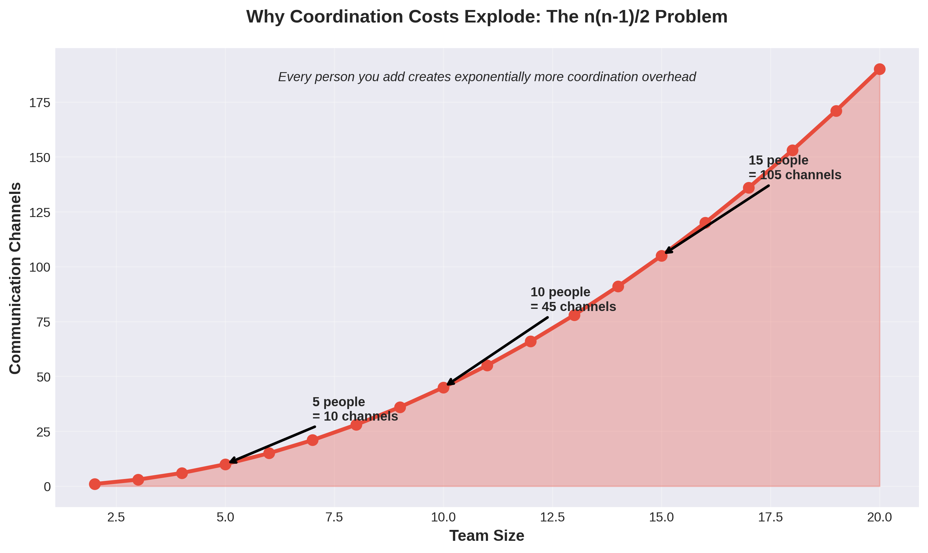 Every one of these channels represents cognitive overhead - not just for the people directly communicating, but for everyone who needs to maintain awareness of what’s happening across the team. Manager time spent in alignment meetings instead of doing actual strategic work. Project delays because coordinating schedules across twelve people is harder than coordinating across six. Duplicated efforts because person A didn’t know person B was already working on something similar. Quality issues because the handoff between person C and person D involved information loss. These coordination costs are real, they’re expensive, and they grow exponentially rather than linearly.