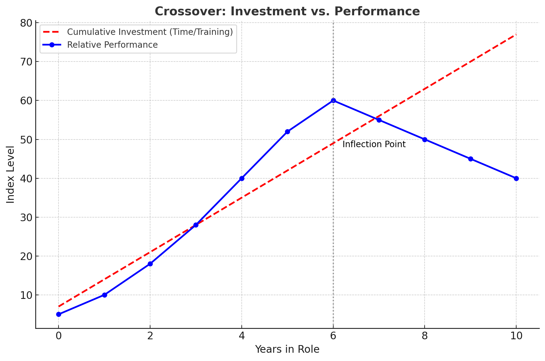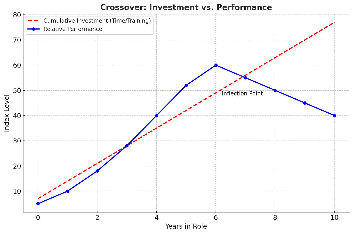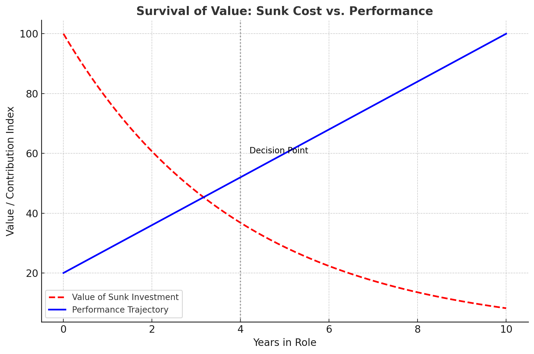 Imagine this in visual terms. Picture two curves on a graph. The first, a red dashed line, represents the value of sunk investment: the onboarding, the training, the tenure. At the beginning, the red line dominates. The investment is heavy, the returns not yet visible. Over time, however, the relevance of that initial investment decays. A year of onboarding doesn’t compound in value — it fades into the background. The second curve, in blue, represents the trajectory of actual performance. Ideally, performance climbs and overtakes the red line. At that moment, the investment pays off. But if performance lags, if the blue line never crosses, then the organization is left carrying a liability. The longer you wait, the more obvious the drag becomes.