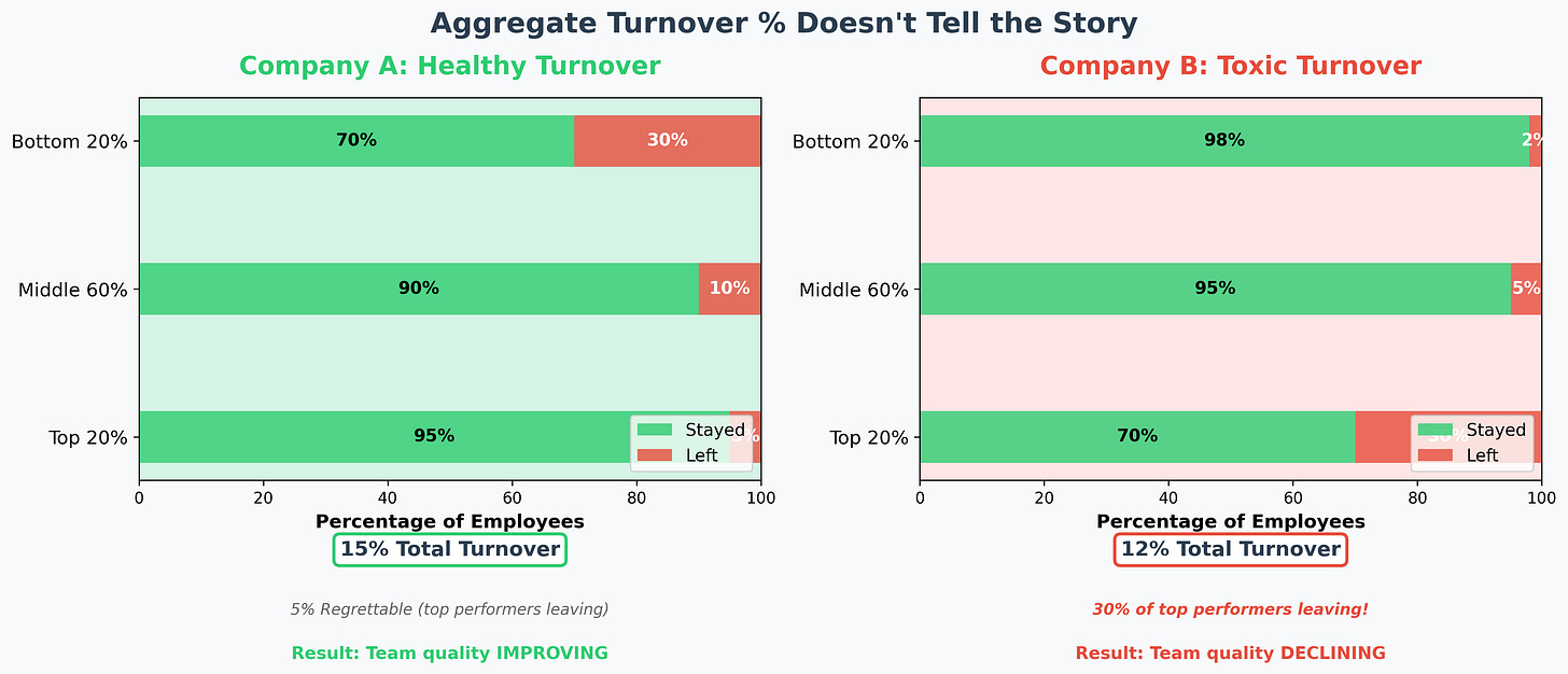 The math: 15% turnover where you lose only bottom performers is much better than 5% turnover where you’re losing your best people. The aggregate retention rate doesn’t tell you anything about whether you’re keeping the right people.