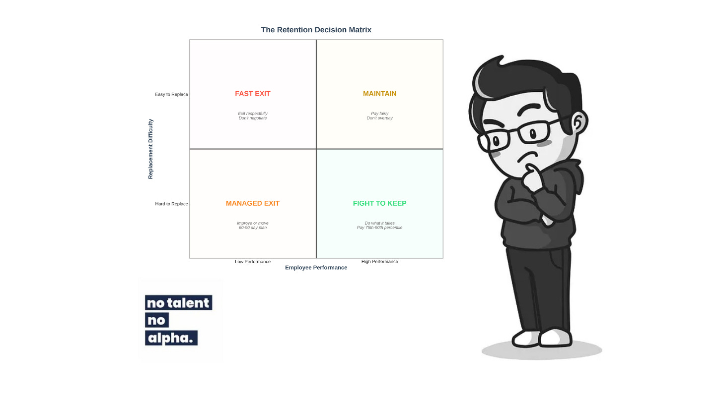 Not because you shouldn’t fight to keep great people - you absolutely should. But because the decision about when to fight and when to let someone go shouldn’t be made in a moment of panic with incomplete information and no framework for thinking through the tradeoffs. Most managers operate on pure instinct when it comes to retention decisions: keep the people you like, accept that others will leave, react to offers when they materialize, hope for the best. There’s no systematic thinking about which retention battles are worth fighting, which exits actually help your organization, or what the real economics look like.
